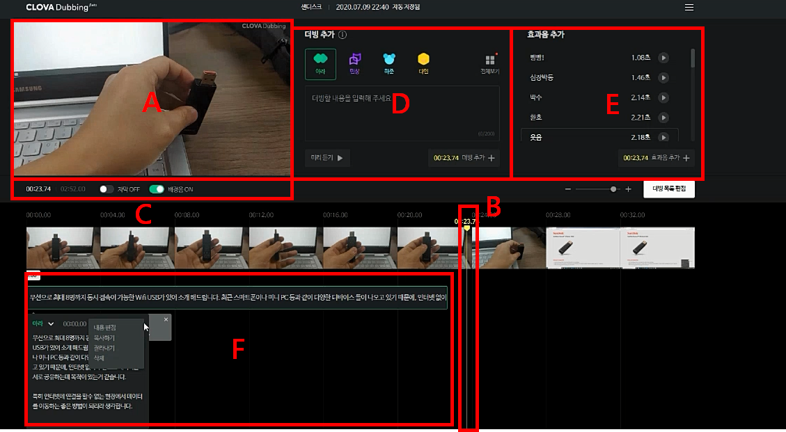 C - 음성과 함께 자막을 삽입하거나, 배경음을 지울 수 있습니다.