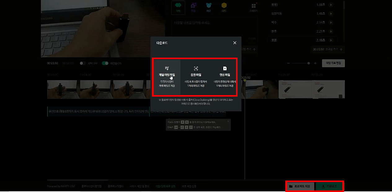 이제 삽입한 동영상을 저장해 볼까요? 맨하단에 프로젝트 저장과 다운로드가 있습니다.