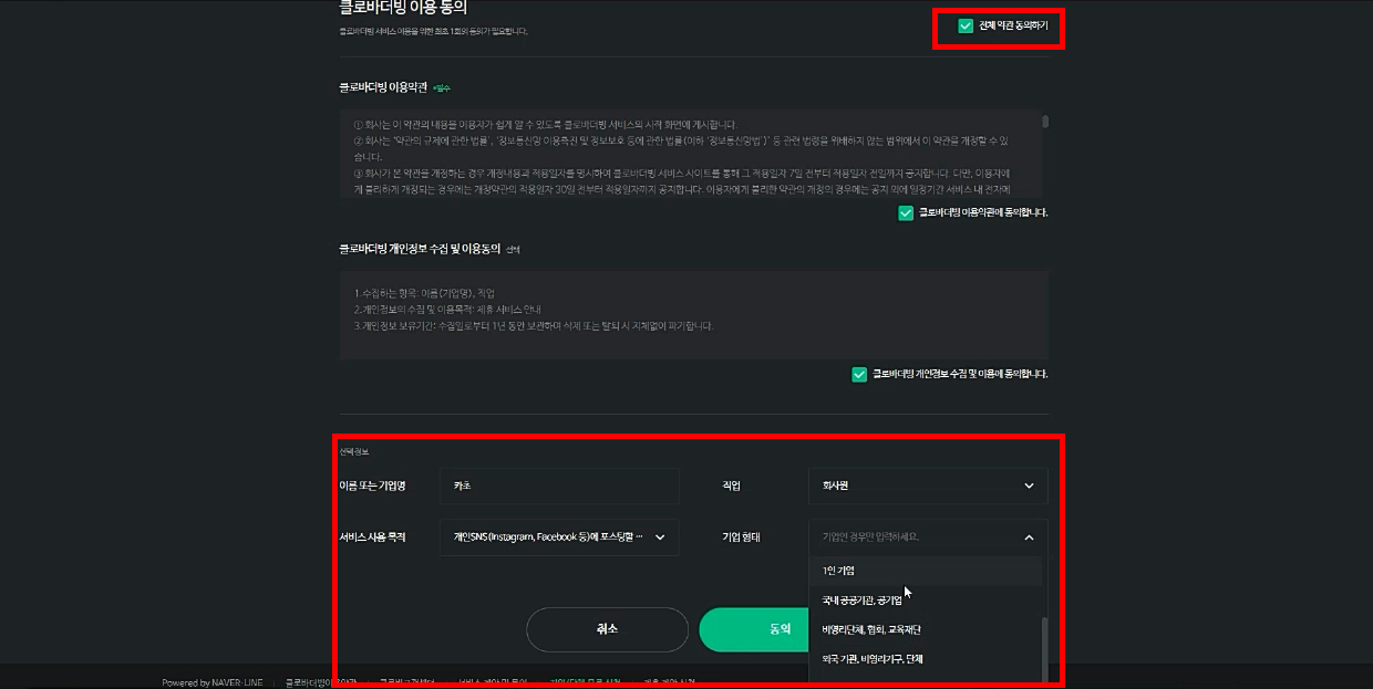 이제 클로바더빙 이용 동의 화면이 출력됩니다. 전체 동의하기 체크박스를 선택하고, 이름, 직업, 서비스 목적, 기업형태 등의 정보를 입력하고, 동의 버튼을 클릭합니다.