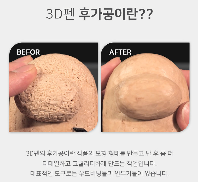 후가공 이라고 하는 작품의 모형 형태를 만들고 난 후 좀 더 디테일하고 고퀄리티하게 만드는 작업을 할 수 있게 하는게 우드버닝툴과 인두기툴 입니다.  사나고3D펜은 그 우드버닝툴과 인두기툴을 제공 합니다.