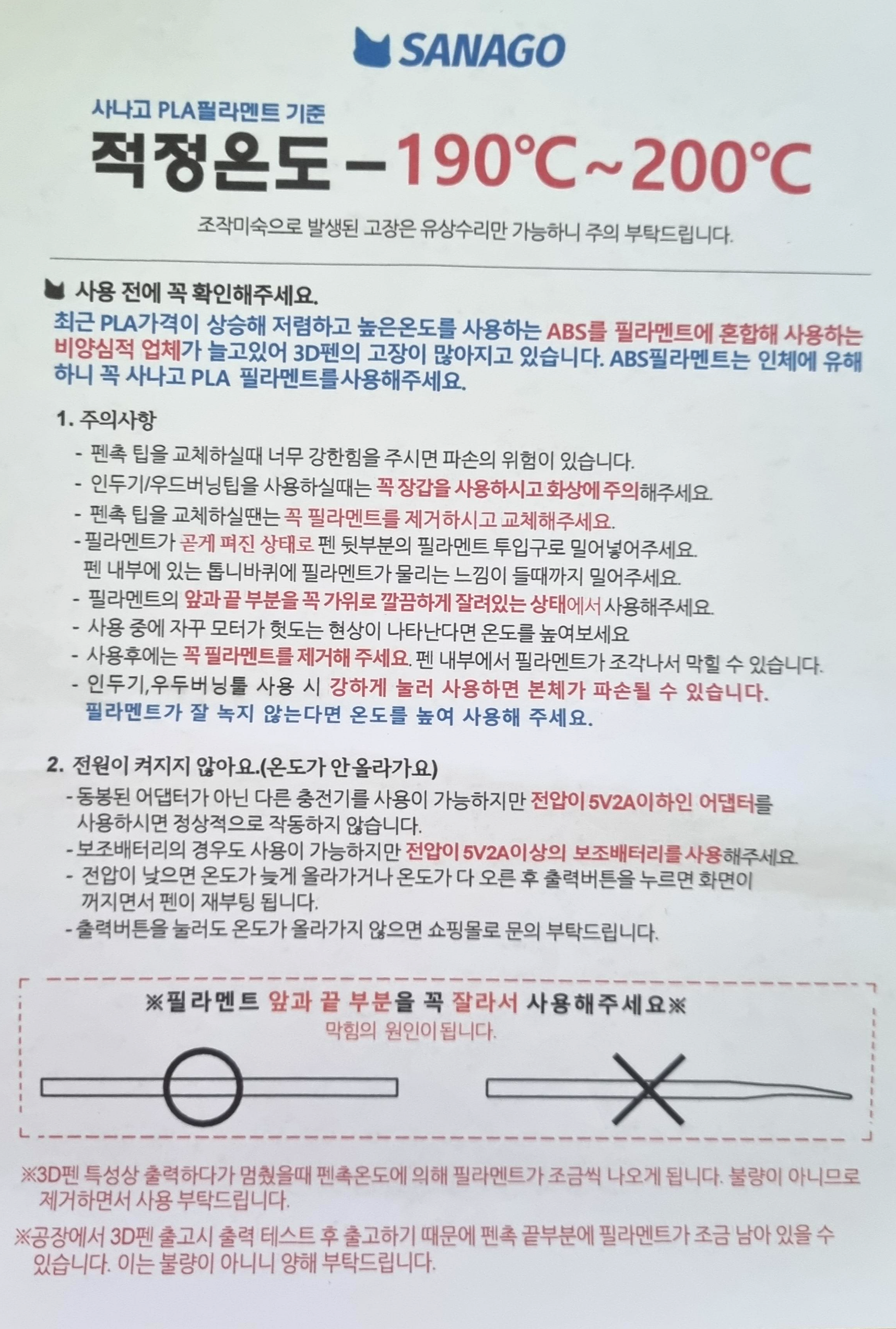 뉴 사나고 3D펜 PLA필라멘트 상품설명서