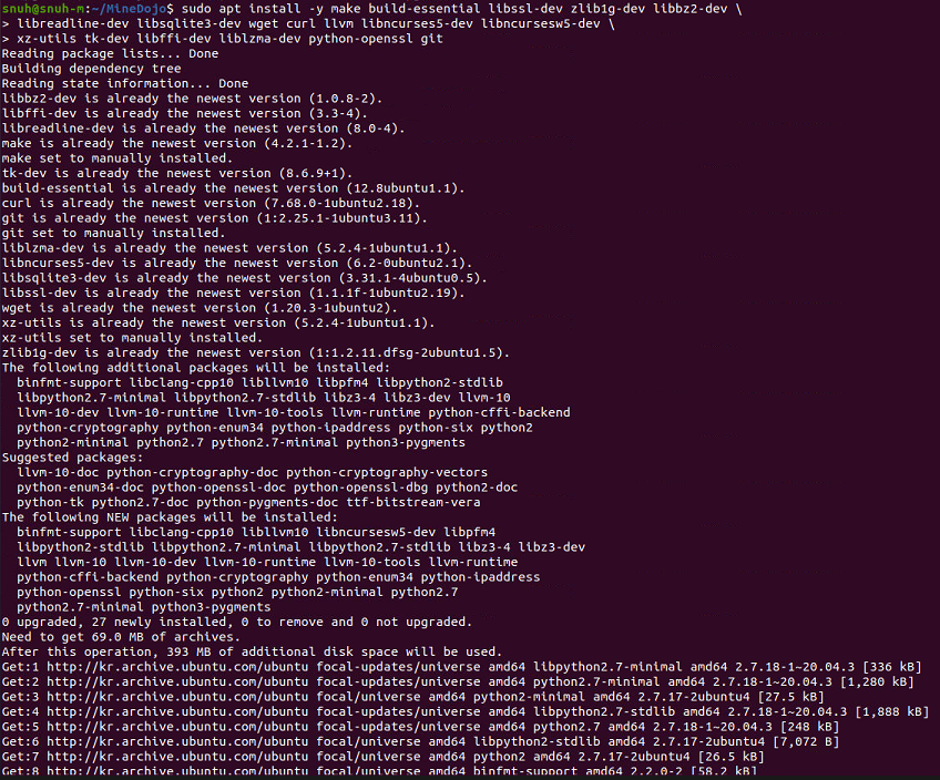 먼저, pyenv의 의존성들을 설치합니다. 아래의 명령어를 통해 설치할 수 있습니다: