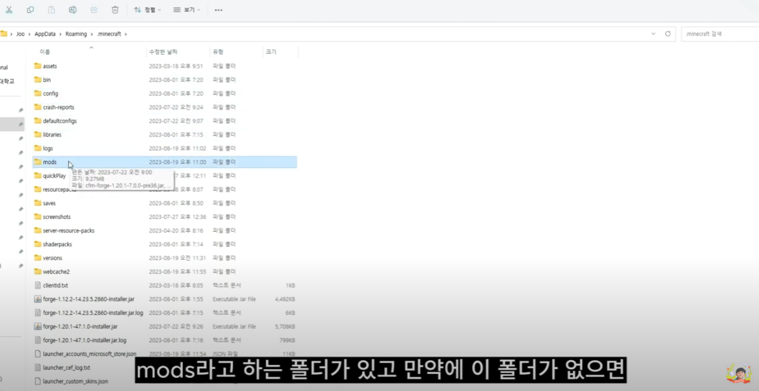 4. 탐색기 창에 %appdata%을 입력하고 .Minecraft 폴더로 이동하고, Mods라는 폴더에 옵티파인 파일을 복사하여 넣습니다. 만약 Mods라는 폴더가 없으면 만들어 넣어주셔야 합니다.