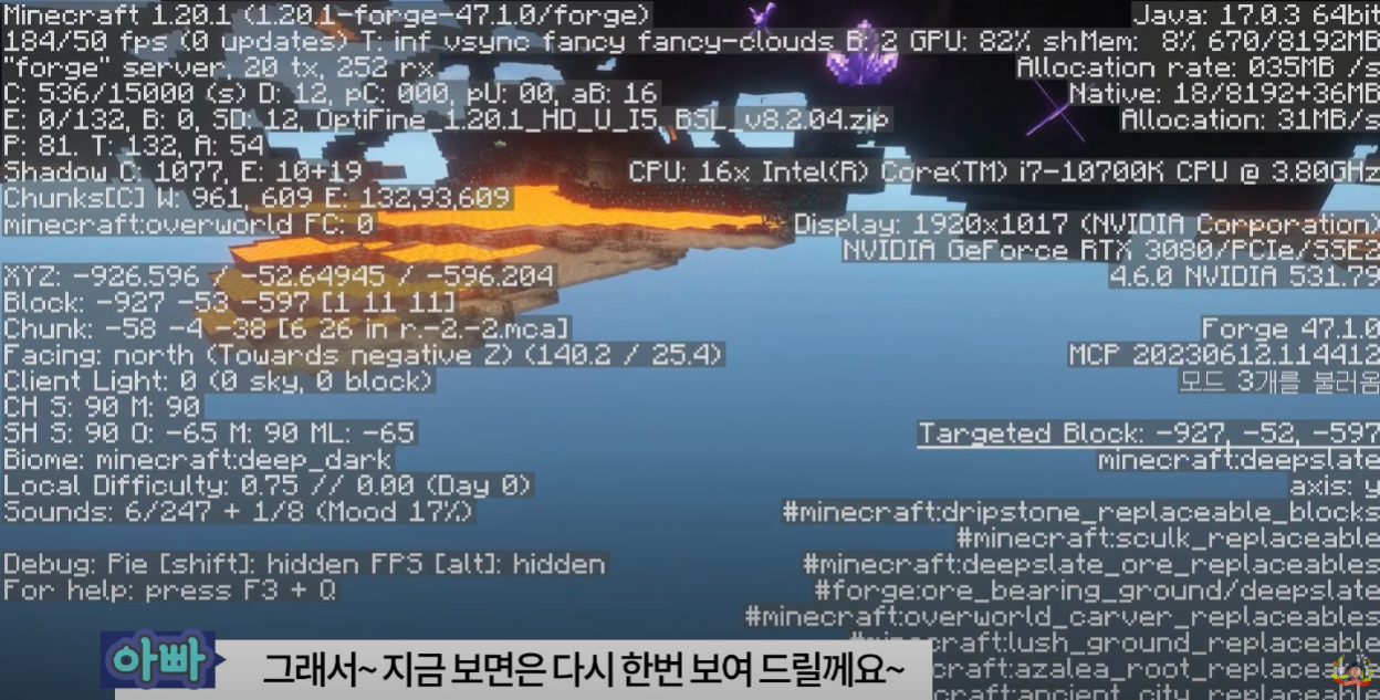 아래 좌표를 보시면 대략적으로 Y좌표 -52~53부터 용암의 분포도가 높은 것을 확인 할수 있습니다. 아래 좌표가 궁금하시면 게임에서 F3 키를 누르면 X, Y, Z 좌표를 확인할 수 있습니다.