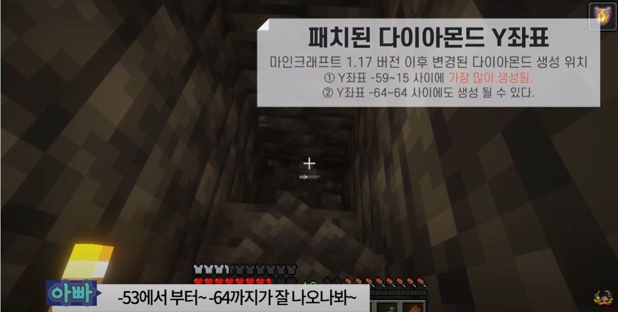 마인크래프트 1.17 버전 이후 부터는 -59~15 사이에 다이아몬드가 생성이 되고 그중에서도 용암이 자주 생성되는 좌표인 -53~-64가 용암 분포도가 높기 때문에 다이아몬드가 잘 생성된다고 할 수 있습니다.
