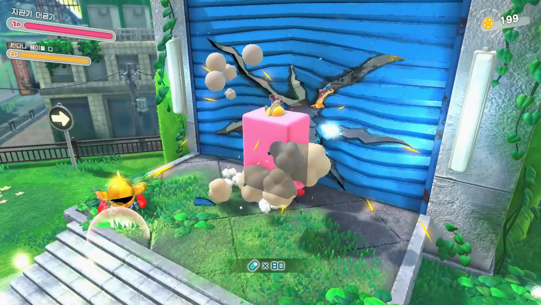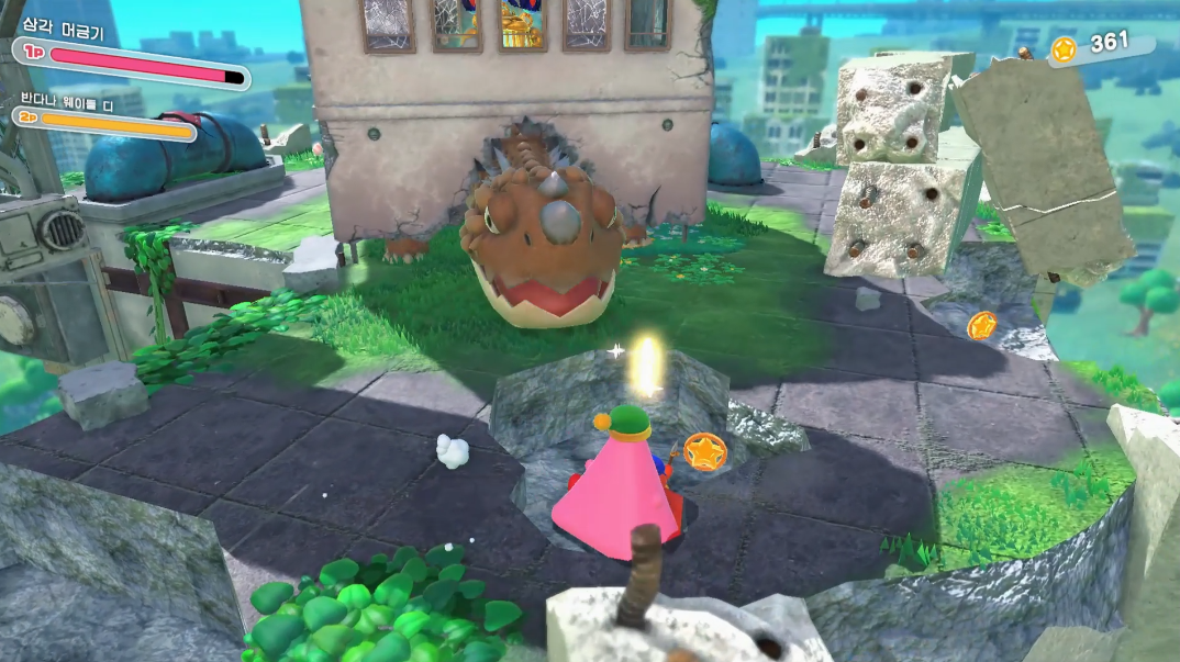 머금기를 한후 거북이가 공격을 해오는데, 옆으로 이동하면서 거북이 위로 올라가 고깔로 찍어줍니다. 그러면 웨이들디를 구출할 수 있습니다.