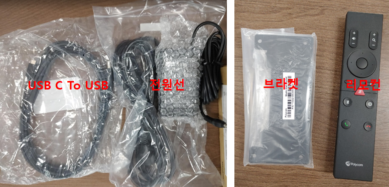폴리 스튜디오 카메라에는 다음과 같이 전원선, 브라켓, 리모컨, USB C To USB 변환 선 등이 들어 있습니다.