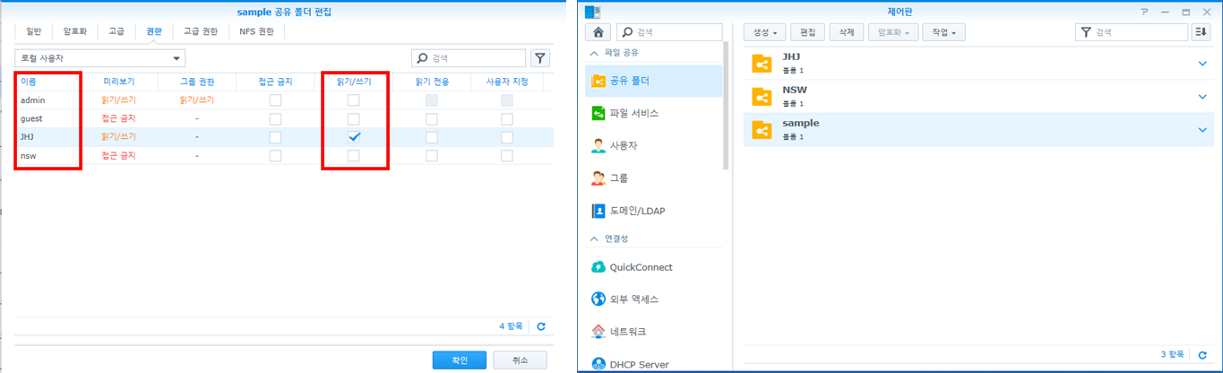 생성한 폴더의 권한 창이 나타납니다. 이름을 보시고 위에서 생성하였던 사용자 계정인 JHJ에 읽기/쓰기(업로드, 다운로드 가능) 권한을 주었습니다. 그리고 확인 버튼을 누르면 폴더 생성이 완료가 됩니다.