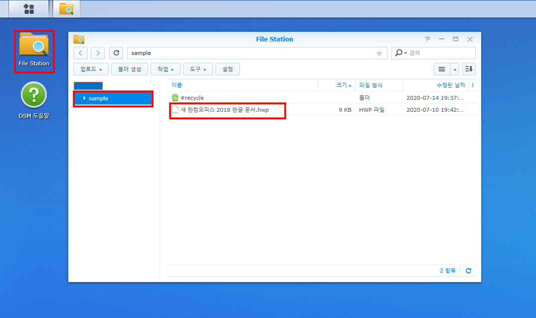 우리가 응용프로그램에서 권한을 주었던 File Station 응용프로그램이 있습니다. 선택하면, Sample 폴더가 만 나타나는 것을 알 수 있습니다. 업로드, 다운로드 권한도 주었으니, 파일을 업로드해서 파일이 NAS에 잘 올라가는 것을 확인할 수 있습니다.