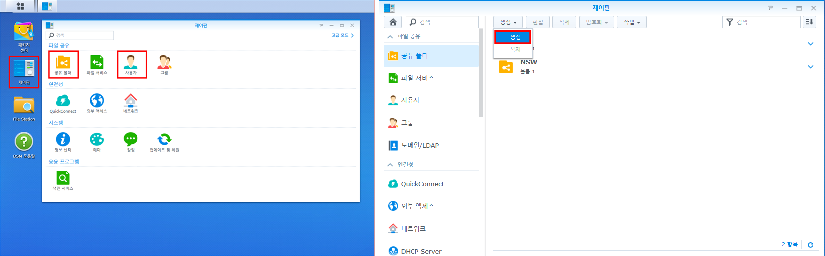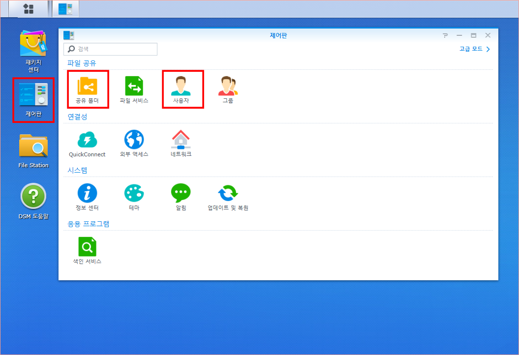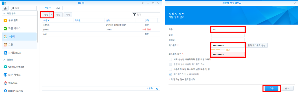 우리가 사용한 기능은 제어판의 '사용자'와 '공유 폴더' 입니다. 사용자를 통해서 관리자 계정 이외의 계정을 만들어주고, 공유폴더를 통해서 특정 폴더를 생성하여 개인만 접속하게 합니다.