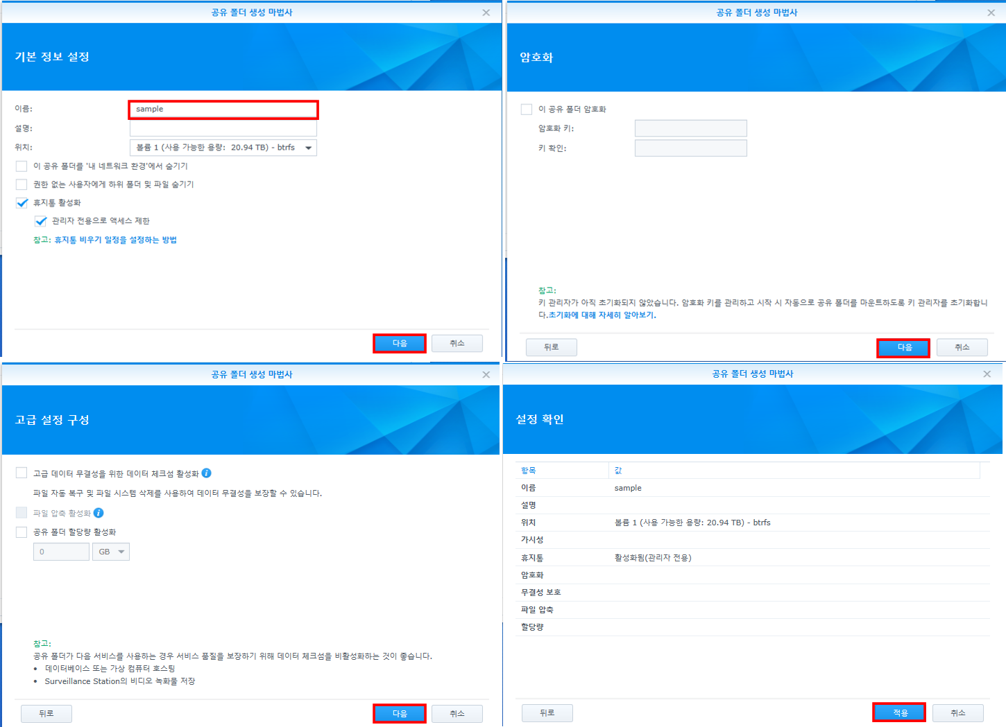이제 생성 마법사가 나타납니다. 이름이 OS 상에서 사용될 폴더의 이름이라고 생각해주면 됩니다. 저는 sample이라고 입력하였습니다. 그다음에 나오는 암호화, 고급설정은 기본값으로 두고 다음으로 넘어갑니다. 암호는 어차피 OS 접속할 때 개인에게 패스워드를 부여하였고, 용량은 특별하게 제한을 할 필요성이 없었습니다.