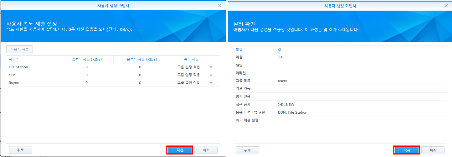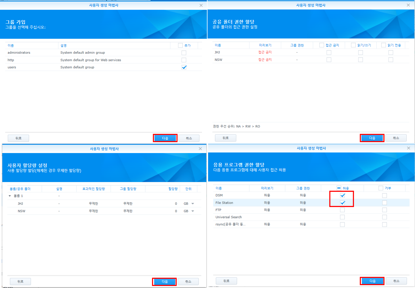 이제 응용 프로그램 권한 할당에서는 DSM와 File Station을 선택하고, 다음 버튼을 선택합니다.