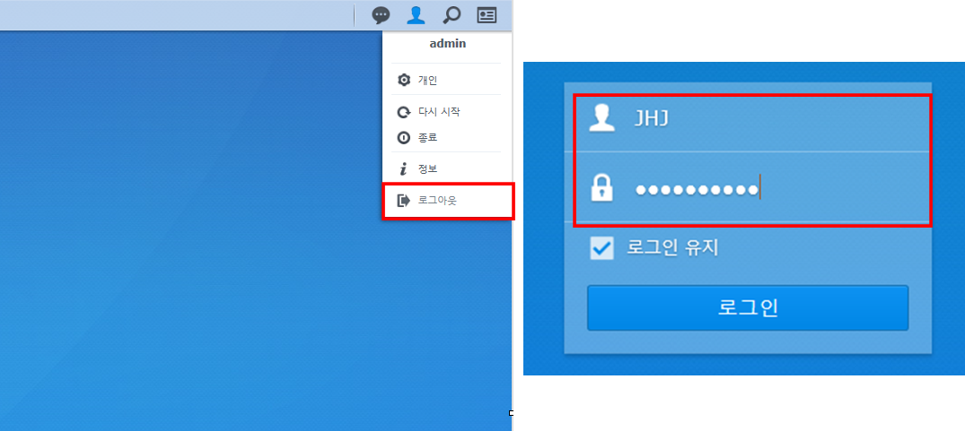 테스트를 해봅니다. 계정을 로그 아웃하고, 생성한 JHJ 계정으로 로그인합니다.