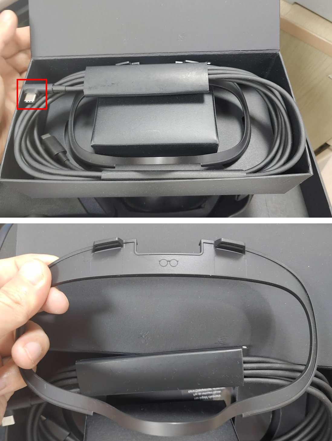 작은 상자를 열어보았습니다. 안에는 충전선과 안경착용을 위한 악세사리가 들어 있습니다.
