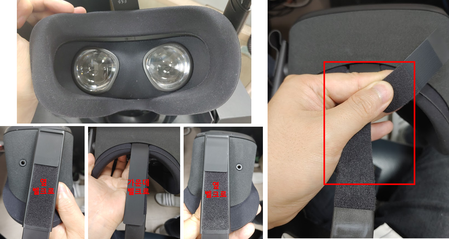 오큘러스 퀘스트를 머리에 착용하고, 양옆 벨크로를 당겨 고정하도록 되어 있습니다.