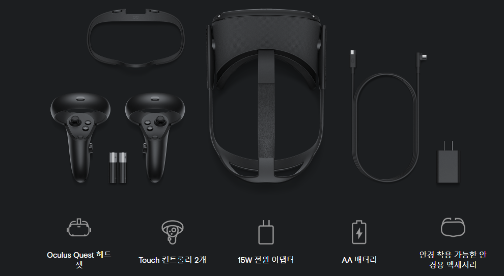 다음과 같이 해드셋본체, Touch 컨트롤러 2개, 전원 어댑터, AA 배터리, USB 선, 안경 착용용 액세서리가 들어 있습니다.