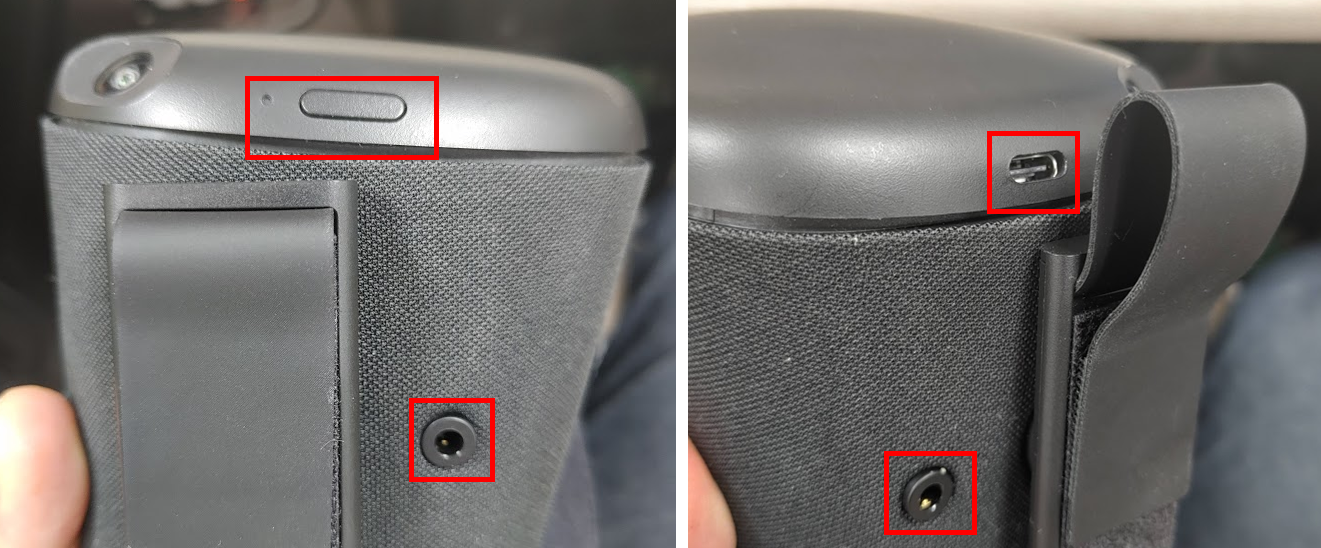 오큘러스 퀘스트를 정면에 두고, 왼쪽 사이드를 보면 전원 버튼이 있고, 반대편에는 USB-C의 충전 단가 보입니다.