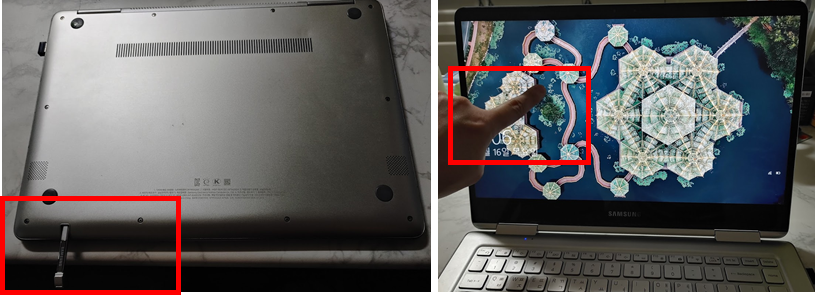 펜은 노트북 뒷면에 부착되어 있습니다. 그리고 노트북 화면을 손가락으로 터치해도 바로 인식이 됩니다.