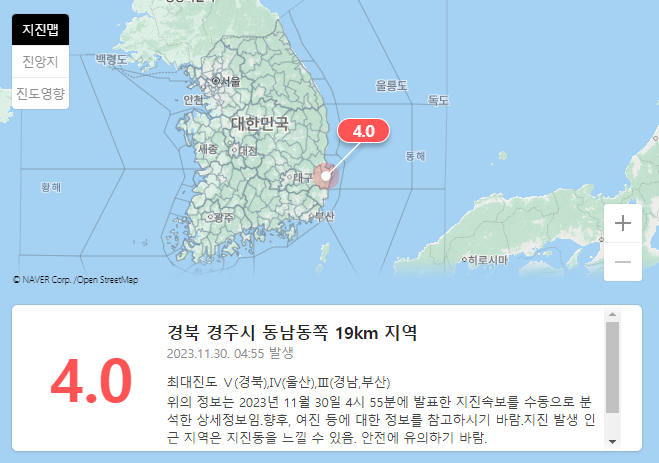 | 경북 경주에서 규모 4.0 지진 발생, 국내 전역에 재난문자 발송 (0) | 2023.12.01 |