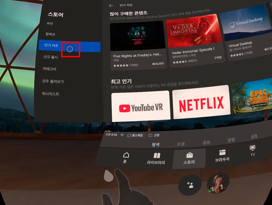 이제 스토어의 메뉴를 이동해볼까요? 위와 같이 엄지와 검지를 붙여 스토어의 버튼을 선택하고, 왼쪽 오른쪽으로 손을 이동하면 스토어 콘텐츠가 이동합니다.