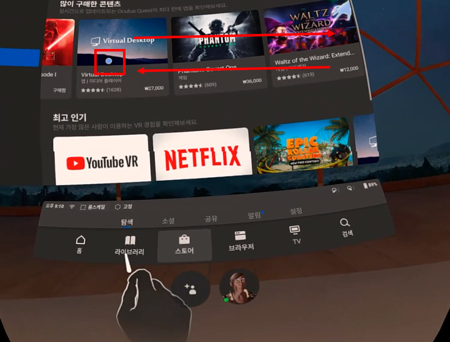 이제 스토어의 메뉴를 이동해볼까요? 위와 같이 엄지와 검지를 붙여 스토어의 버튼을 선택하고, 왼쪽 오른쪽으로 손을 이동하면 스토어 콘텐츠가 이동합니다.