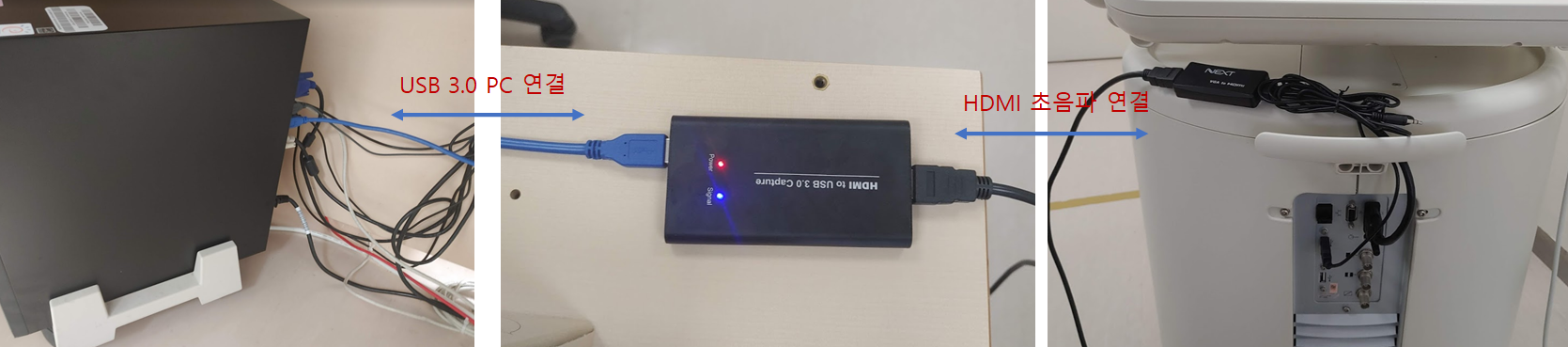 이제 모든 선을 연결만 하면 됩니다. PC의 USB 3.0 케이블을 비디오 캡처 카드에 연결하고, 초음파에서 나오는 HDMI 단자도 비디오 캡처카드에 연결합니다.