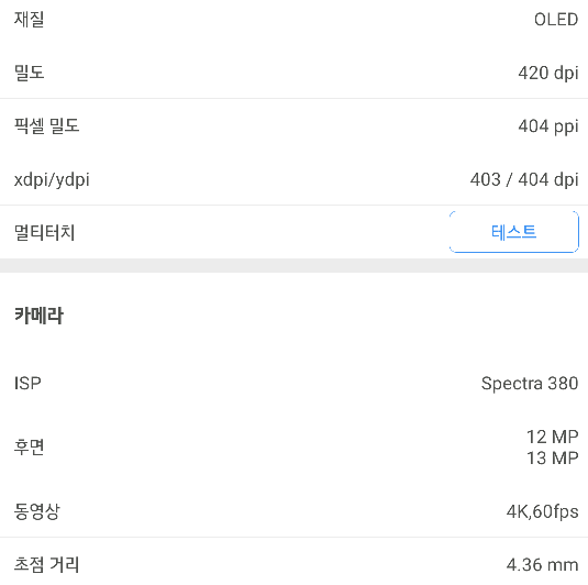 재질은 OLED를 착용하고 DPI는 420 입니다.