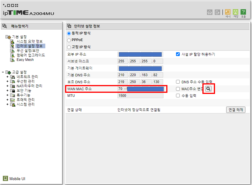 관리 도구 -> 기본 설정 인터넷 설정 정보 메뉴로 진입합니다. 그러면 WAN MAC 주소를 확인할 수 있습니다.