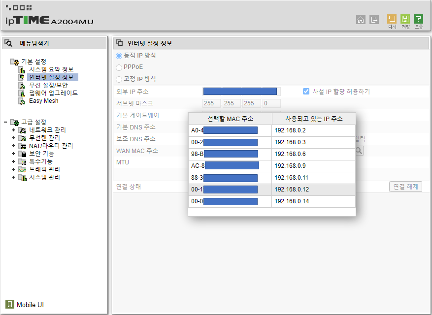 위 상단의 돋보기 아이콘을 클릭해봅니다. 사진이 사용하고 있는 랜카드 들의 맥 주소(MAC Access)가 나타납니다. 만약 공유기 설치하기 전에 랜카드의 맥 주소(MAC Access)를 사용하고 사용해야 하는 상황이 생긴다면 리스트에서 맥주소를 선택해주면 됩니다.
