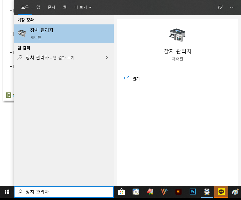 이제 변경하는 방법에 대하여 알아보겠습니다. 시작 -> 검색 -> 장치관리자를 실행합니다. 제어판을 통해서 장치 관리자를 찾으셔도 됩니다.