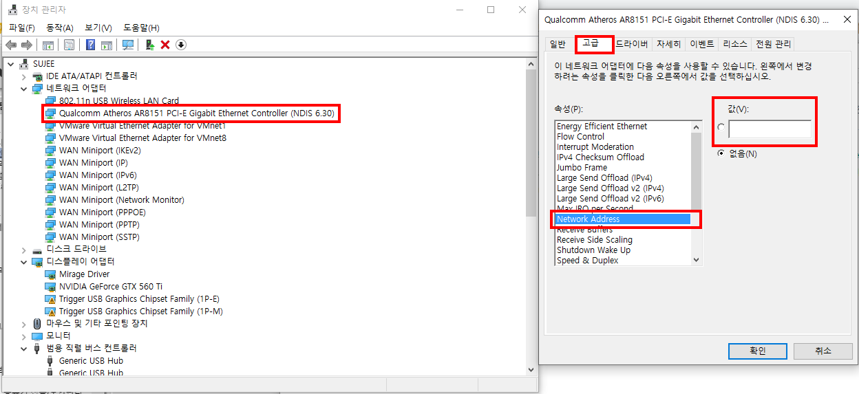 랜카드 맥주소의 경우 제조사와 모델명 마다 고급 탭에서 수정 할 수 있는 정보가 조금씩 다릅니다. NetWork Address의 메뉴도 없는 랜카드도 있으니 참고 부탁드리겠습니다.