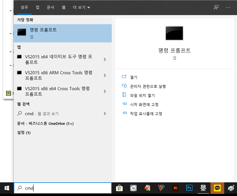 이번에는 랜카드의 (MAC Access)를 조회하고 변경하는 방법을 알아보겠습니다. 윈도우 10의 경우 시작 -> 검색 -> 명령 프롬프트를 실행합니다.
