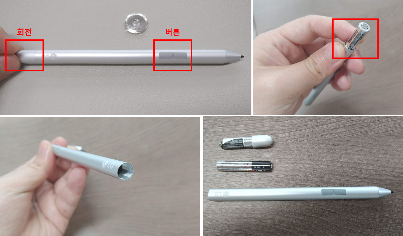 펜을 살펴 보겠습니다. 맨 끝단을 손으로 잡고 돌려주면, 건전지가 나옵니다. 배터리로 AAA를 사용하고 있습니다.