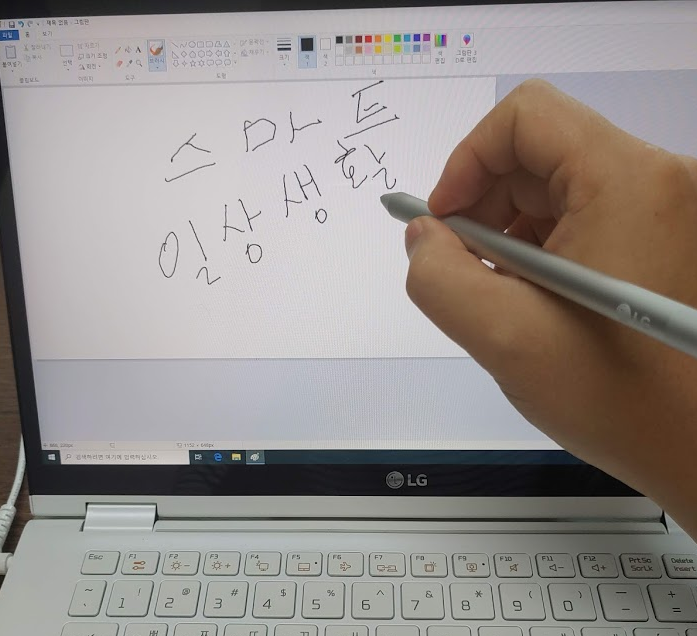 펜 기능을 조금 더 테스트하기 위해서 윈도우의 그림판을 열었습니다. 그위에 "스마트 일상생활"이라고 적어 보았습니다. 필기감은 나쁘지 않습니다. 모니터 각도를 조절하고, 사용하면 훨씬 활용도가 높을 거 같습니다.