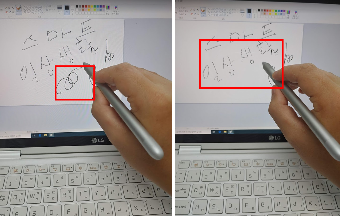 펜인데 필기를 하였다면 지우기도 가능해야겠죠? LG 스타일러스 펜의 2번째 버튼을 누르고 "일상생활" 부분을 지워 보니 글자가 사라지는 것을 확인했습니다.