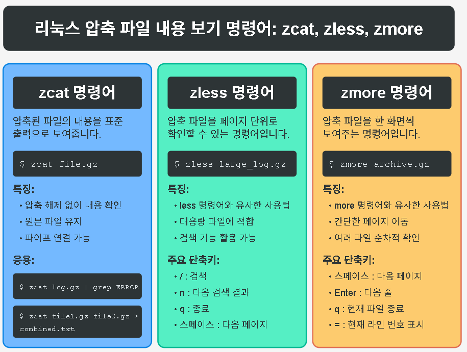 이 명령어들은 gzip으로 압축된 파일(.gz)을 대상으로 작동하며, bzip2(.bz2)나 xz(.xz) 압축 파일에는 bzcat, xzcat 등의 유사한 명령어를 사용해야 합니다.