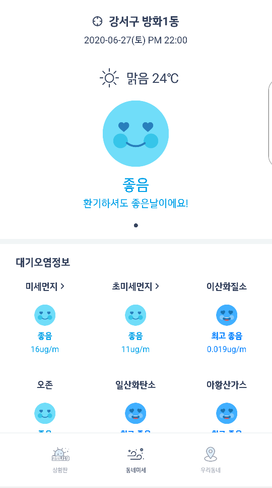 권한을 모두 주면 메인화면에서는 다음과 같이 지역별 미세먼지 현황을 파악 할수 있습니다.