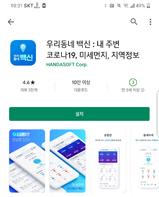 오늘은 모든 정보를 한번에 모아둔 앱을 소개 하고자 합니다. 구글 스토어에서 우리동네 백신 어플을 다운로드를 진행합니다.