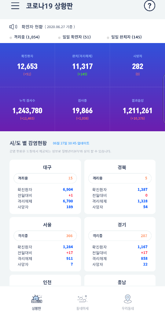 하단의 코로나 19 상황판을 선택하면 현재 종합 확진자와 지역별 확진자와 현황을 파악 할수 있습니다.