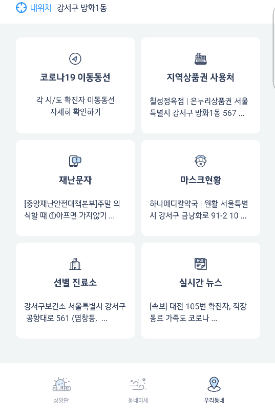 이번엔 우리동네 버튼을 클릭 해볼까요? 코로나19의 이동동선을 파악하기 위하여 각 시/도 홈페이지와 모두 연동을 해놓았습니다.