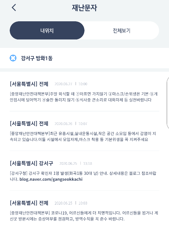 장소별 재난 문자 또한 위치에 따라서 잘 정리가 되어 있는게 눈에 들어 옵니다.