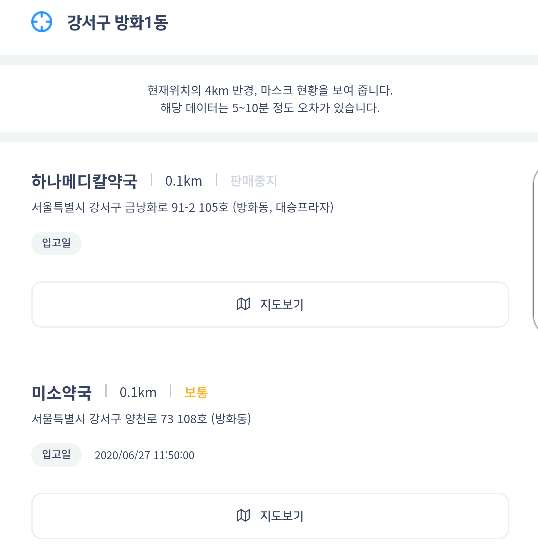 그리고 마스크 현황은 나의 거리를 기준으로 가장 가까운 장소부터 표시 됩니다.