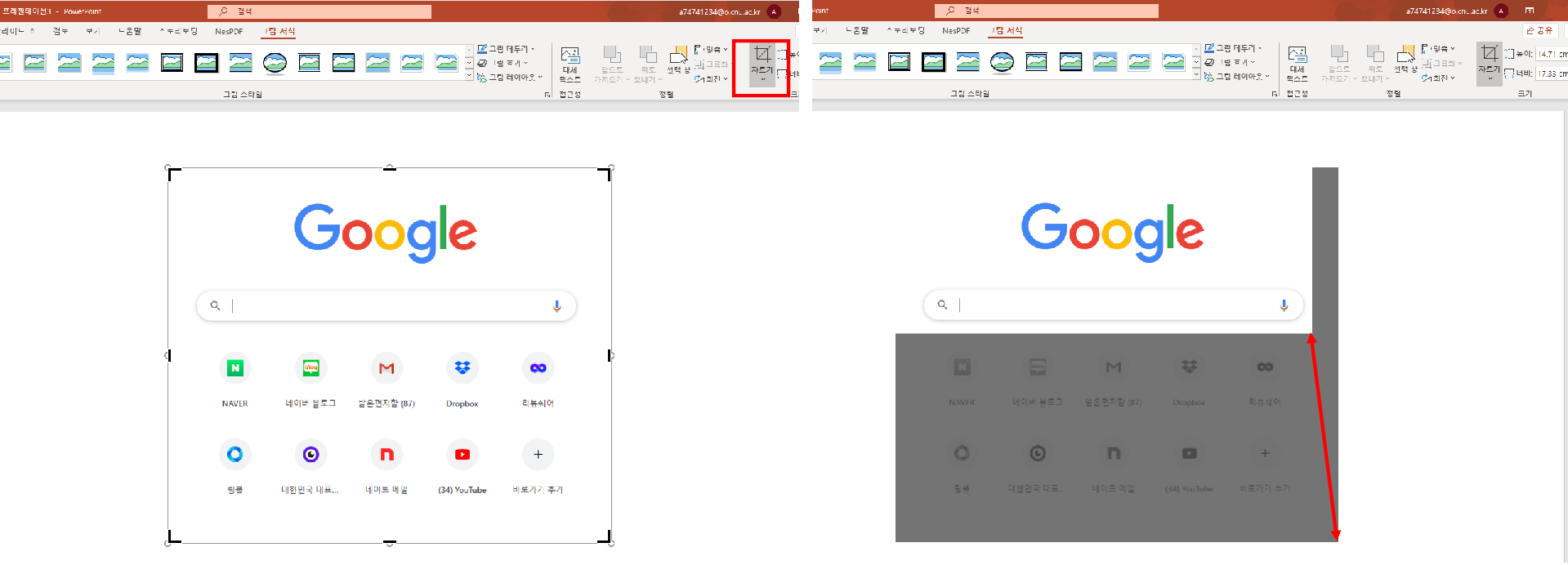 예전에는 파워포인트 (PowerPoint)에서 사진 자르기 기능 등을 가로, 세로를 숫자를 입력해서 편집했던거 같은데, 어느순간 보니 그림서식으로 쉽게 편집할수 있도록 기능이 많이 있네요; 도대체 나는 언제 적 사람인지 모르겠습니다.