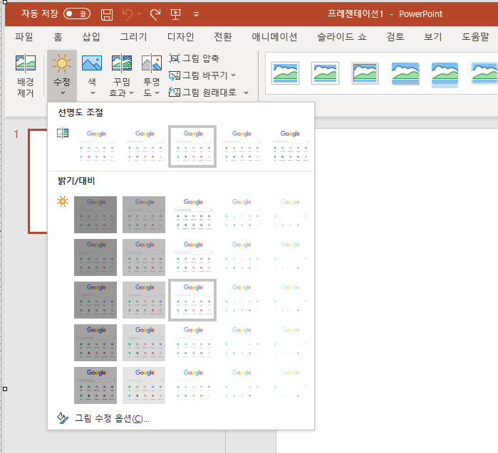 수정 버튼을 통하여 이미지의 선명도와 밝기를 조절 할 수 있습니다. 특히 선명도의 경우 이미지 자체글자를 강조 해줄때 사용하면 좋습니다.