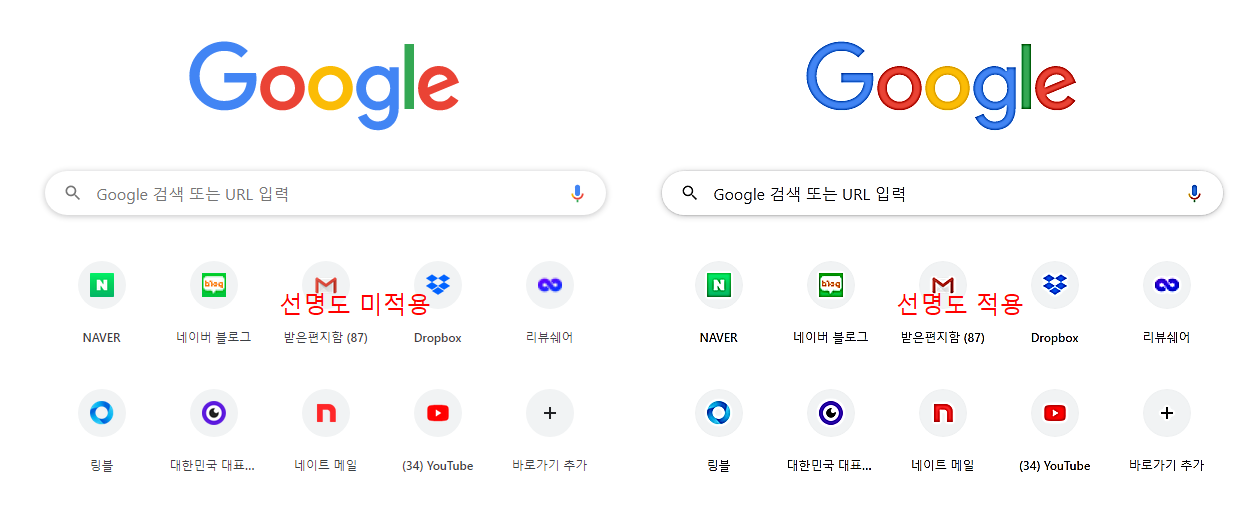아래 이미지는 선명도를 적용한 이미지와 미적용한 이미지 입니다. 글자가 확실히 잘 보입니다. 아이콘이나 구글 이미지는 변화가 있으니 주의 해야 합니다.