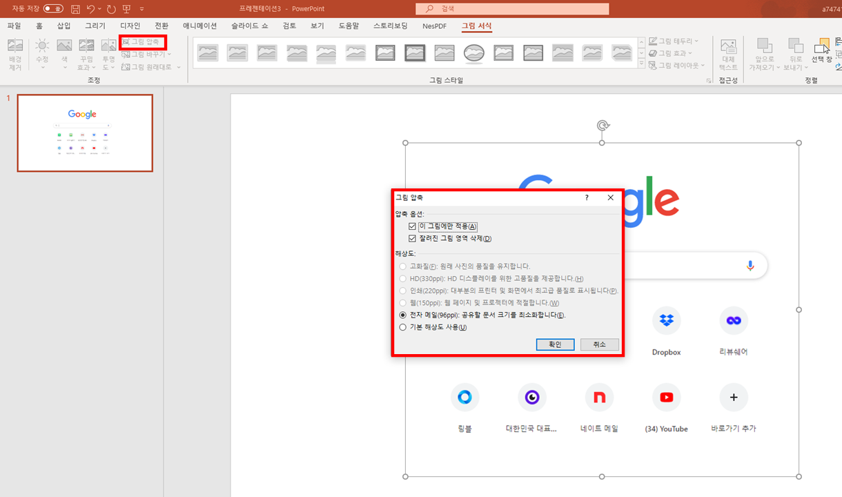 알씨 처럼 이미지의 해상도를 줄 일수 있습니다. 이를 통하여 파워포인트 (PowerPoint)의 용량을 줄이고 빠르게 실행할수 있습니다. 파워포인트가 그림 위주로 100장 이상 많은 이미지를 사용하시는 분들에게 최적화 할수 있는 노하우 입니다.