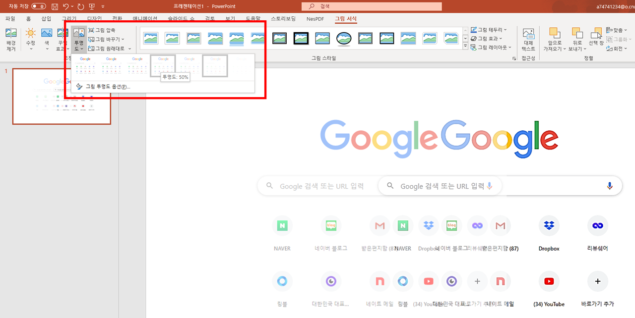 투명도도 손쉽게 적용 할수 있습니다. 저는 투명도는 포토샵으로 했는데 이제는 파워포인트로 간단하게 할 수 있습니다.