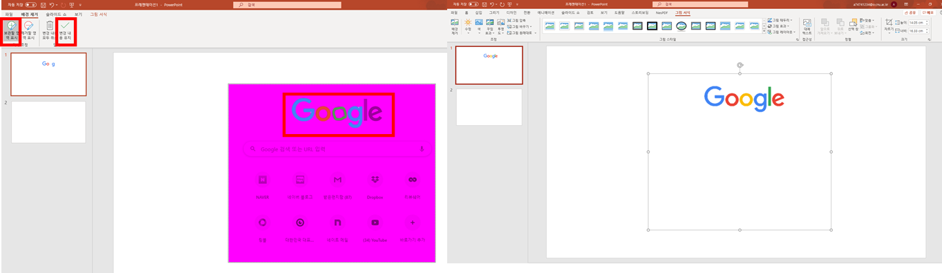 보관할 영역 표시 버튼을 누루고, 보관할 부분을 선택 합니다. 이때 모든 부분을 선택하지 않아도 자동으로 범위를 인식해서 테두리 영역까지 선택 해줍니다. 저는 Google이라는 글자를 선택해봤습니다. 선택을 완료하였다면 변경 내용 유지 버튼을 누르면 Google이라는 글자 빼고 모든 이미지가 사라진 것을 확인 할 수 있습니다.
