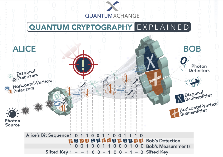 - 특히 0 과 1 의 이진정보를 양자상태에 실어서 보내는 양자통신의 경우에 전송되는 이진정보를 누군가가 도청하게 되면 수신자는 즉각 도청자의 존재를 인식하게 되고 따라서 통신을 중단한 후 상황에 알맞은 대처 한다.