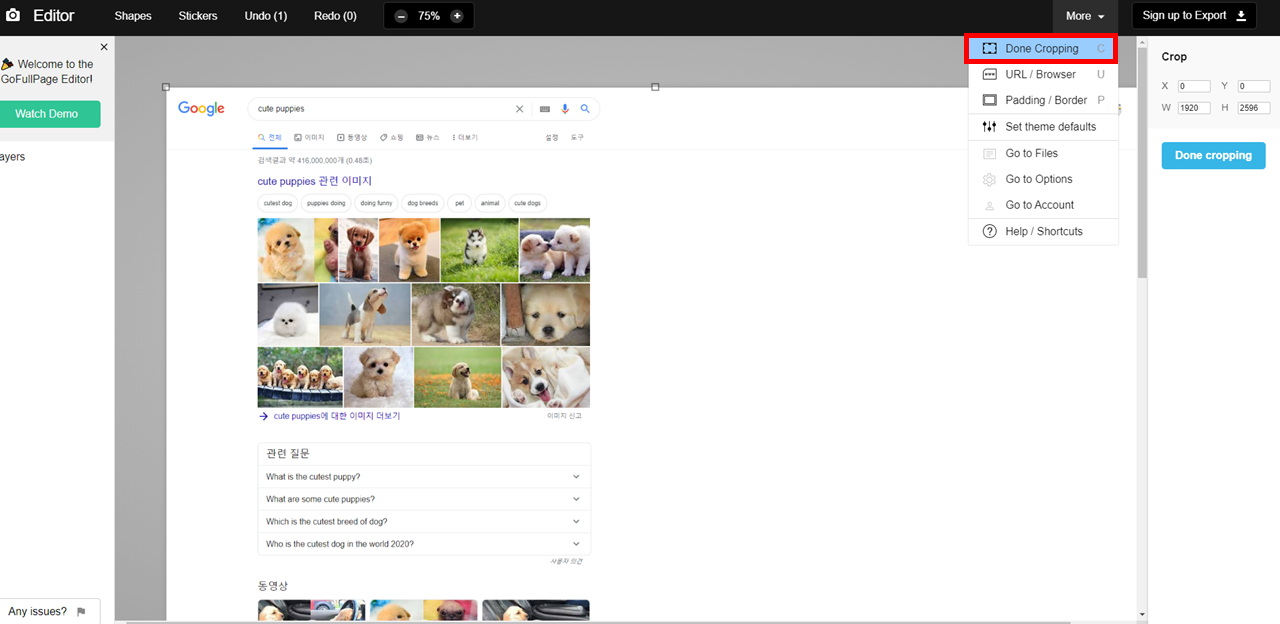 영역을 지정하셨다면 왼쪽 버튼의 Done Cropping 편집의 완료 됩니다.